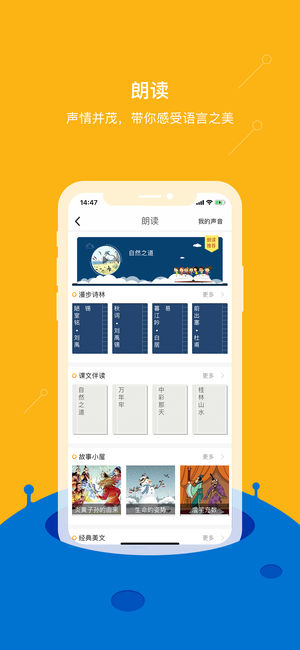 朗读:课文伴读,漫步诗林,经典美文等各种语音,可听可跟读,成就诗书达人