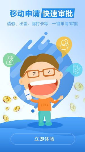 =在手机上打卡,移动中签到,轻轻松松不迟到!=公司组织架构通讯录,美女帅哥随便撩!=随时随地一键发申请,移动考勤数据直接生报表!