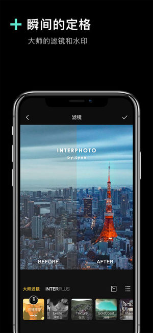 InterPlus场景滤镜:人像、美食、胶片、黑白、经典电影滤镜等,还有多种照片编辑工具:曝光、增强、饱和度、暗角、颗粒、褪色,高阶曲线等;