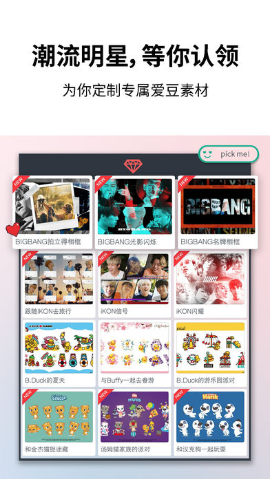 特效、贴纸、音效、转场素材每月更新,更有iKON、BIGBANG、SECHSKIES、会说话的汤姆猫家族、B.Duck小黄鸭、蛋黄哥官方授权视频素材!