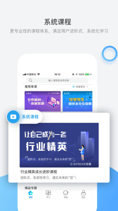 国内寿险首款专业性、体系化的一站式学习平台,结合线下面授班课程提供经典、不受时空限制的在线学习方式,力争成为从业人员身边随时随地可触达的“培训部”;平台课程内容聚焦绩优人员培养、中高端客户开拓、行业精英修炼,以及卓越组织打造等专题,以“窄而深”的方式分享可复制的实战型内容,帮助学习者建立“正确工作、正确思考、正确销售、正确学习、正确生活”重要观念,以引领每一位追求专业化经营人员走向辉煌成功之路。