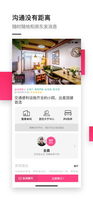 你可随时随地打开小猪APP,选择自己喜欢的特色房源或房间,查看房源照片,了解房源和房东的介绍及价格信息,并与房东进行在线沟通,第一时间掌握这些短租日租房、民宿客栈或是酒店式公寓的详情,轻松完成住宿预订。