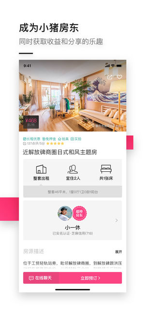 作为国内最大日租短租房、酒店式公寓和民宿的在线预订平台,小猪让你的出行更多选择,更加自由。你可远离千篇一律的酒店,栖息于山海之间,酣睡在市井胡同;
