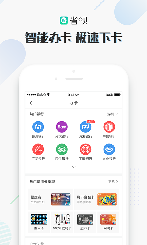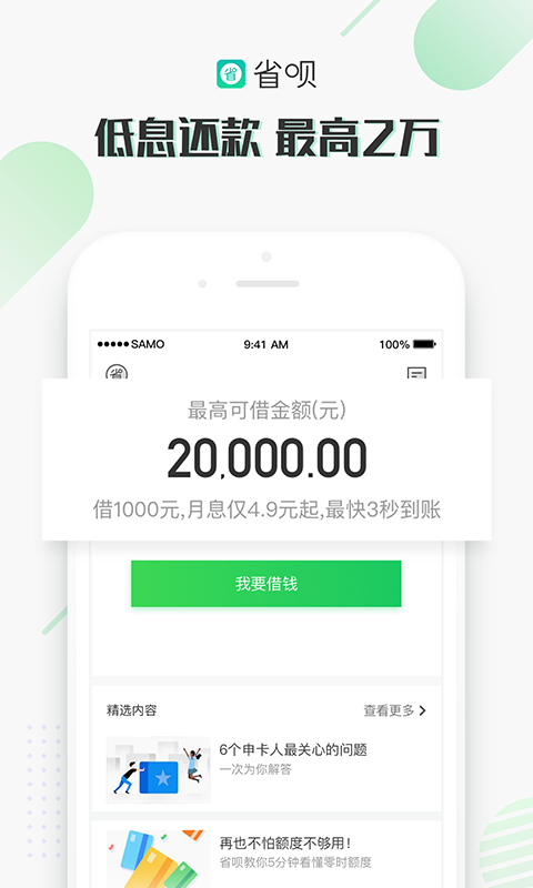 省呗是深圳萨摩耶互联网金融服务有限公司打造的一款金融理财贷款软件,本作万元借款额度,无面签,无电话骚扰,有信用卡就能申请。喜欢的快点下载吧。