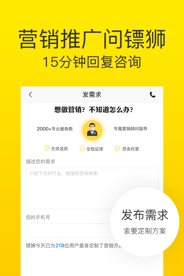 镖狮是北京发镖网络科技有限公司打造的一款全新营销推广软件,本作有营销大咖7 x 12小时,免费为你出谋划策,并为你找到"靠谱"的服务商。需要的快点下载吧。