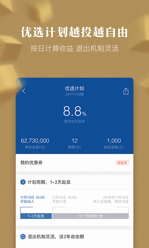 2、新人投资专享期待年回报率10.0%新手标,锁定期1个月。
