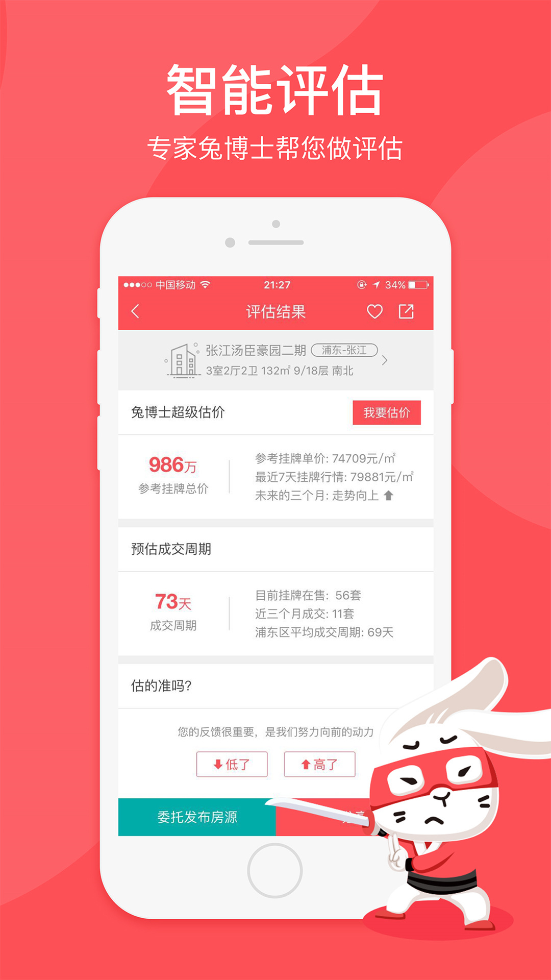 根据房屋信息,兔博士超级大脑帮您智能生成房屋当前估价,做您买卖房子时候的合理参考,买房卖房心中有底了!
