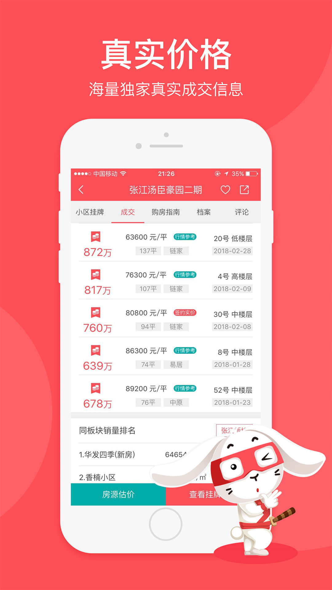 各家机构海量真实成交信息整合发布,住宅小区历史交易套数、成交价格、房价走势一目了然,兔博士用先进的大数据技术努力消灭信息不对称,让您再也不会被虚假信息蒙骗了!