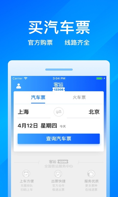 客运12308是全国官方的客运购票中心,可以满足用户查询汽车票、火车票、机票、船票、酒店的时刻表,价格及预订的需求。