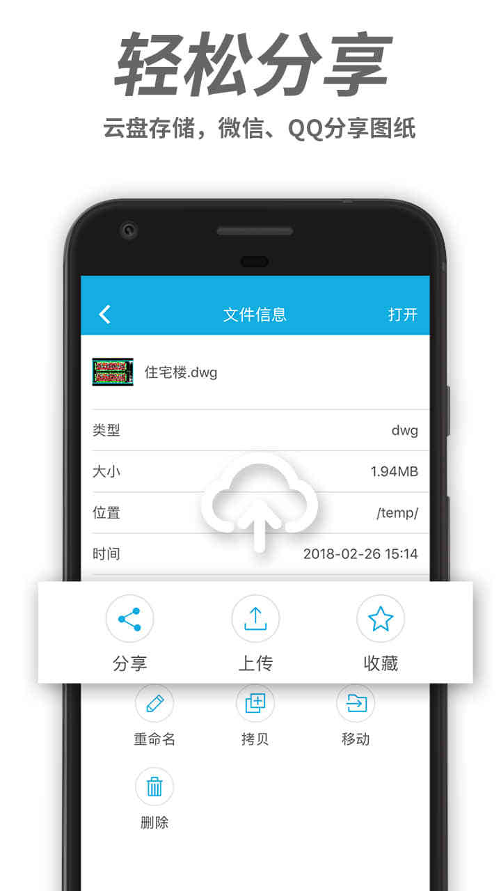 5.轻松分享,支持微信、QQ、微博等社交工具,CAD图纸交流再无障碍;