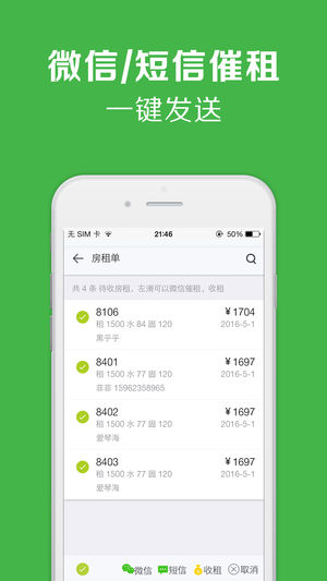 2.【微信催租】通过微信向租客好友发送最新房租单,通知其缴纳;不需要添加租客为好友,也可以向其发送房租单,支持群发;