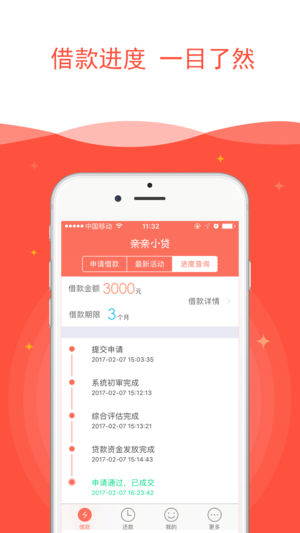 亲亲小贷App是专为有消费分期借款需求的人提供的借款应用工具,提供额度3000-20000元,期限3-12个月的信用借款服务,为用户带来快速、便捷的借钱、还钱体验。