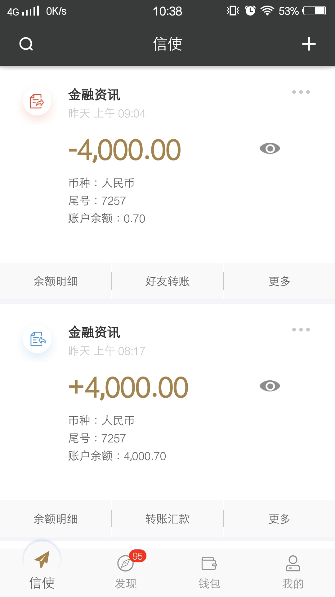 全新的信使、发现、钱包栏目,助您轻松打理账务、便捷查阅信息、消费与服务一点通。