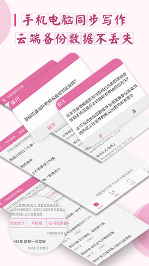 5,支持云端备份和恢复到本地,多重机制保护数据安全,不用担心小说丢失,更支持手机和电脑同步写作,同时兼顾方便和快捷