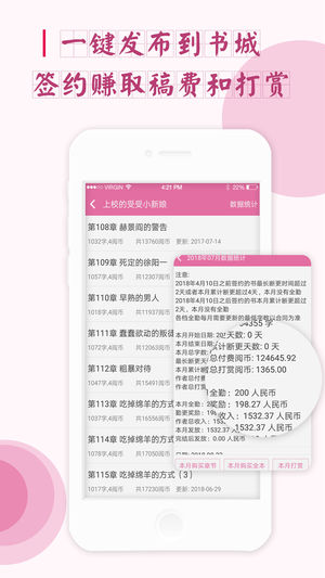 3,支持一键发布小说到书城、支持定时发布新章节,让千万读者阅读您的小说。可以和读者交流互动,可以得到读者的打赏和礼物。符合签约条件的小说可以直接和我们签约,赚取稿费