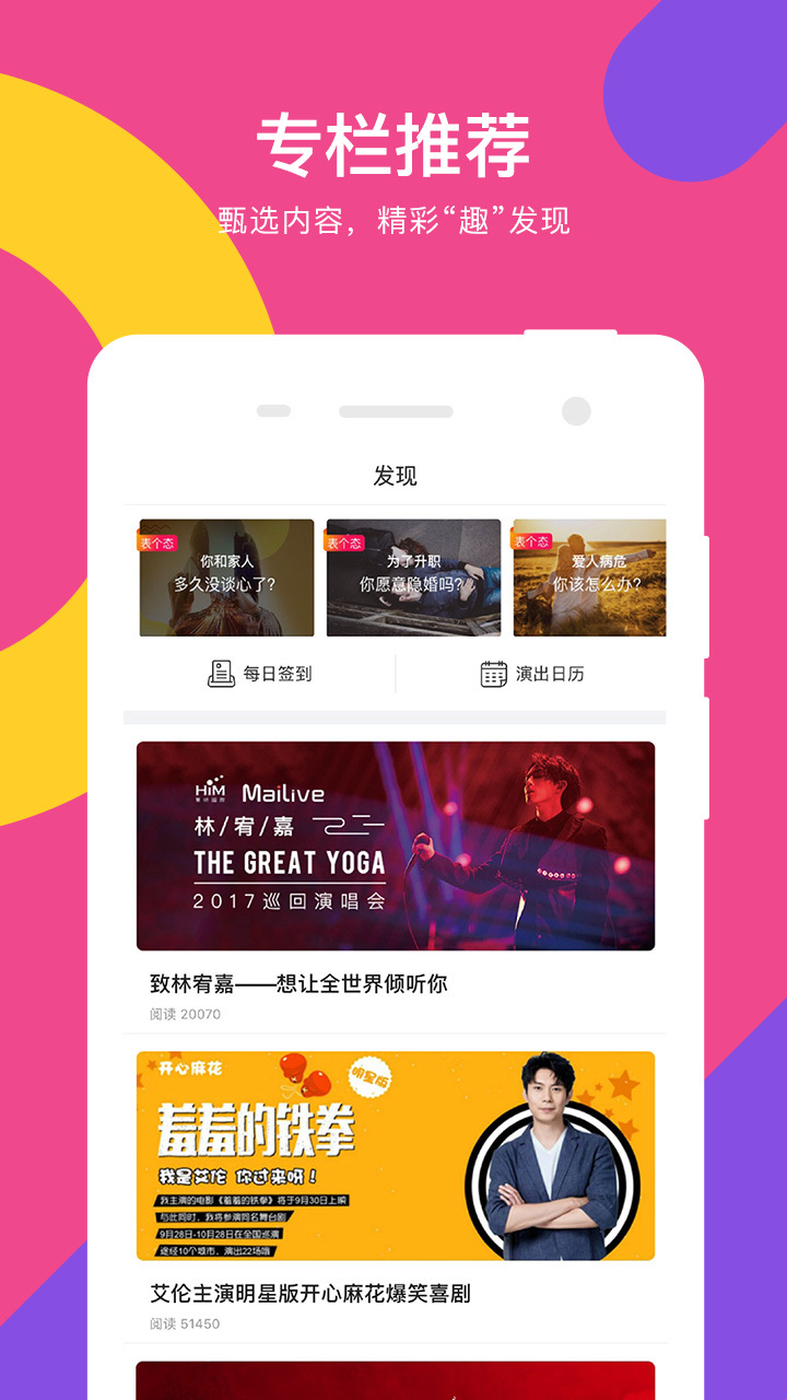 不要每次约会都是吃吃吃,看看话剧不是更美妙~用演出日历,挑选合适的日期和演出,爱情、亲情、爆笑、惊悚...现场气氛要比电影过瘾多了!自从有了大麦演出日历,妈妈再也不用担心我空虚寂寞没人陪啦!