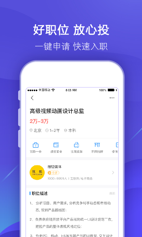 智联在手,工作我有!史上更难就业季,智联招聘依然给力!海量最新最真实的工作机会随时投递,理想职位分分钟到碗里!手机上智联,求职超方便,靠谱工作随“薪”选!