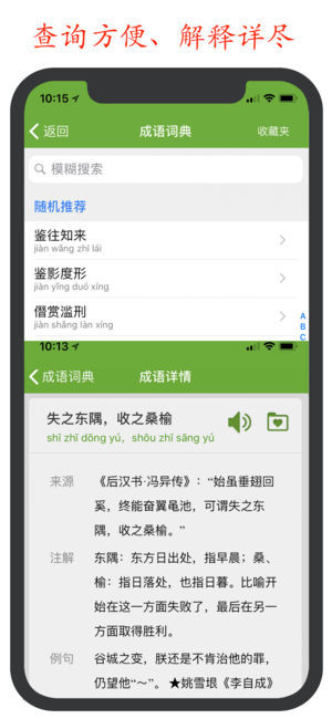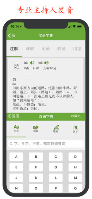该应用主要提供字词的查询,汉字详情中包括:读音、笔画、部首等,还包含基本解释、详细解释、常用词、编码、字源字形等。让你由简入繁,轻松掌握该汉字。词语包含读音、基本解释、近义词、反义词等。更清晰明了让你了解词语的意思。应用通过拼音查字、部首查字、笔画查字、分类查询四大类为你导航,并支持语音搜索,让你更快更方便的查询到自己需要查询的字词。应用支持离线查看功能。