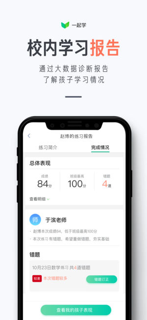 【掌握孩子学习情况】 学习报告:校内作业和学习能力测评反馈,随时查看孩子学习动态和作业成绩,了解知识点掌握情况,进步退步随时掌握。 错题本:系统自动记录孩子的学习情况,收集错题内容,找出孩子薄弱环节,提供类型题和易错题练习,提高孩子学习效率,让学习更有针对性; 批改速算:各种纸质速算本,一秒拍照批改出成绩,帮助孩子打好口算速算基础,从根本提升数学成绩和运算能力;