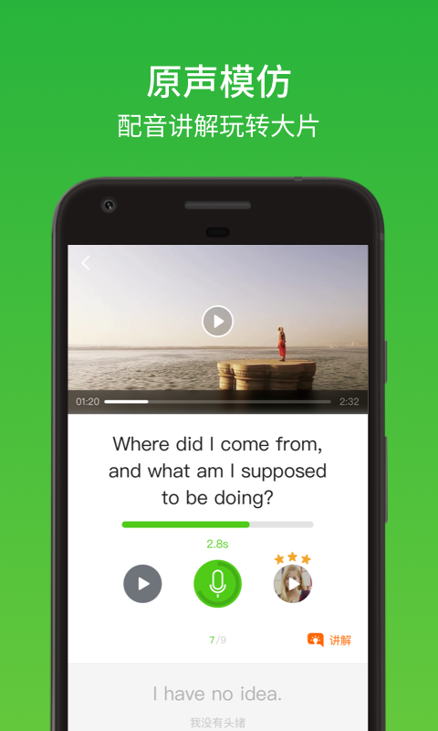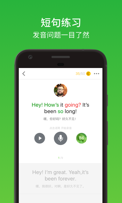 内置来自硅谷顶尖语音识别技术,给你的英语口语实时打分,矫正发音。