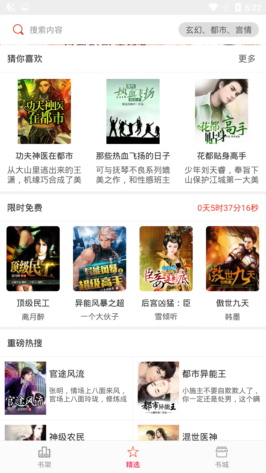 主菜单包括书架页,精选页,在线阅读、随看随藏,操作简便易上手,界面来回切换,自由畅读。