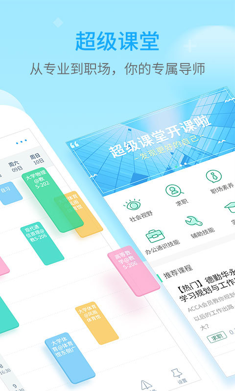 超级课程表是一款为学生准备的app,用户们可以在这里进行课程与成绩的查询,还能够在这里进行聊天,找到合适的朋友,让你在校园里过的开心,喜欢的快来下载吧。