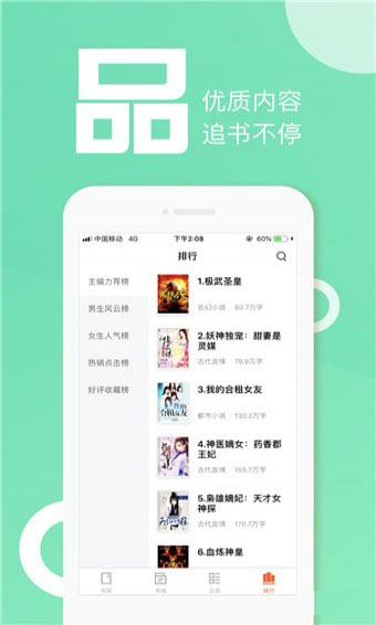 4、优推荐:热门排行榜,男生女频,猜你喜欢,给你想要的榜单分类,找书轻松,不闹书荒。