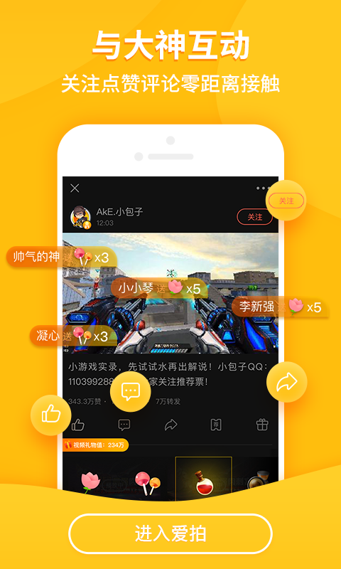 玩家特色社交:送礼、陪玩、吐槽、加粉、打赏、挑战…和小伙伴们一起玩游戏录视频,给力!