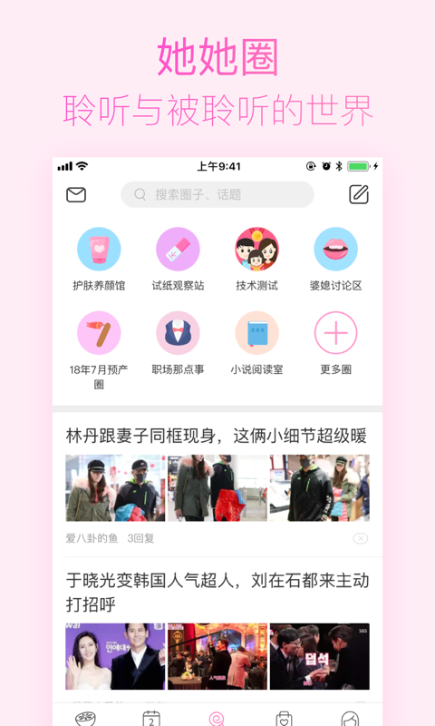 【她她圈姐妹】100多个不同女性交流圈,每个圈子都能找到志同道合的姐妹一起聊大姨妈月经期、一起八卦男神、一起吐槽烦心事、一起学化妆、一起减肥、一起美容、一起丰胸、一起研究星座、一起找周边好吃好玩的事情....每天都有好多姐妹陪你,让我们不在无聊。