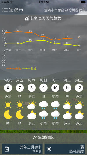 宝鸡天气是一款天气预报app,用户们可以随时查询宝鸡的天气,无论是旅游还是居住生活,还有很多新的功能,喜欢的快来下载吧。