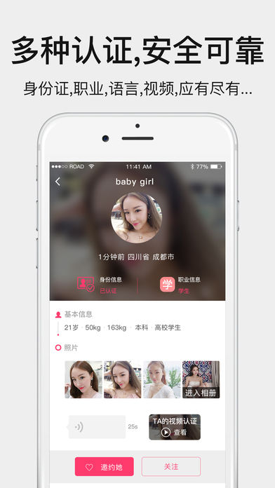5、【高端真实】贵觅有严格的身份认证系统,加入贵觅,男士需要身份认证和车辆认证,女士需要职业认证,人脸识别,视频认证。