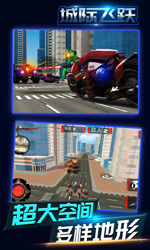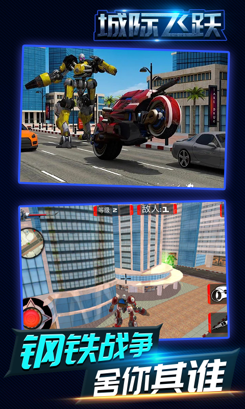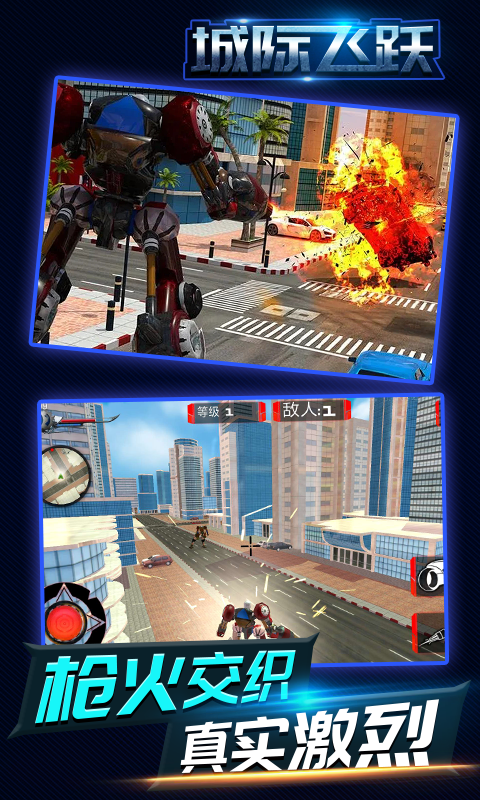 城际飞跃游戏是款以机器人为主题的动作射击类游戏,在游戏中玩家将体会到各类熟悉的机器人,从城市的这边在飞越这边我,哇!这的好神奇好好玩啊,来游戏选择你喜欢的机器人,来游戏就下载体验吧