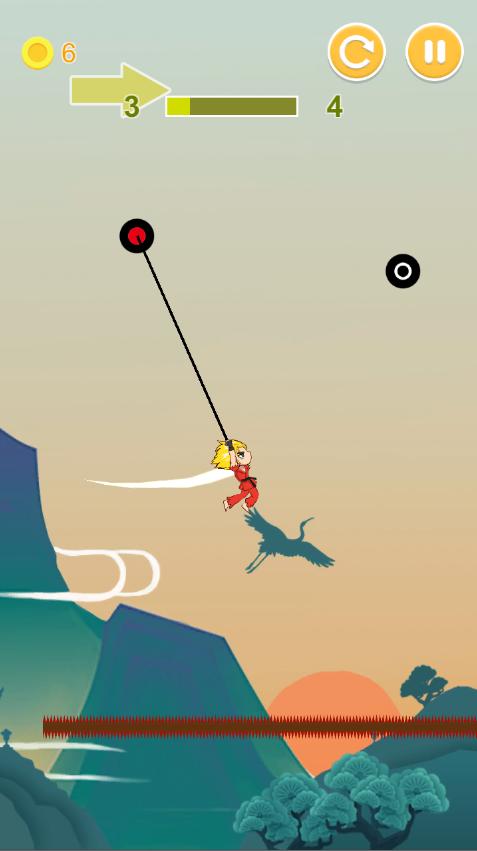 游戏中按下你的屏幕,用火柴人的手抓住绳索,然后释放,跳跃到另外一个挂钩上面,如此循环。