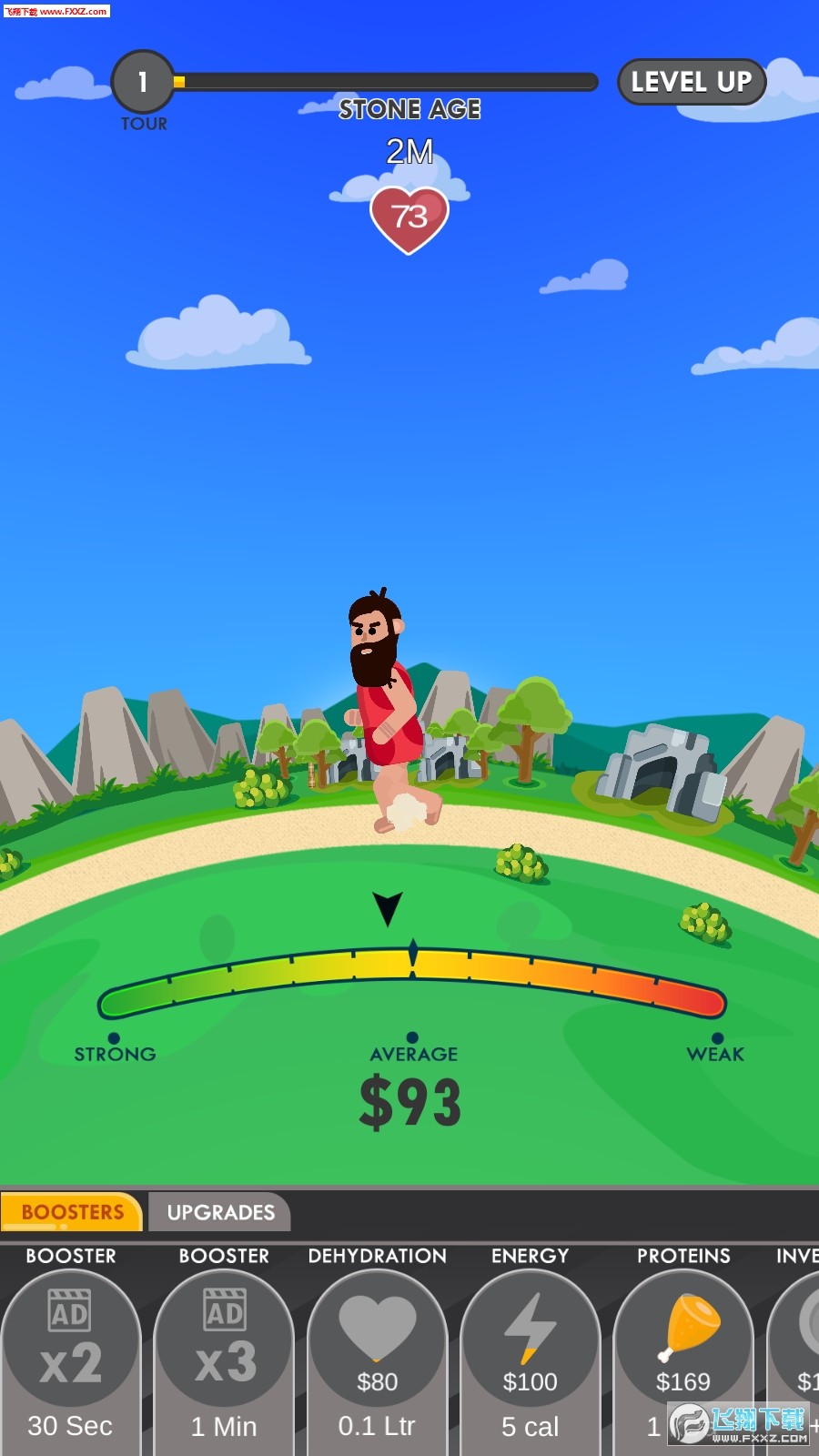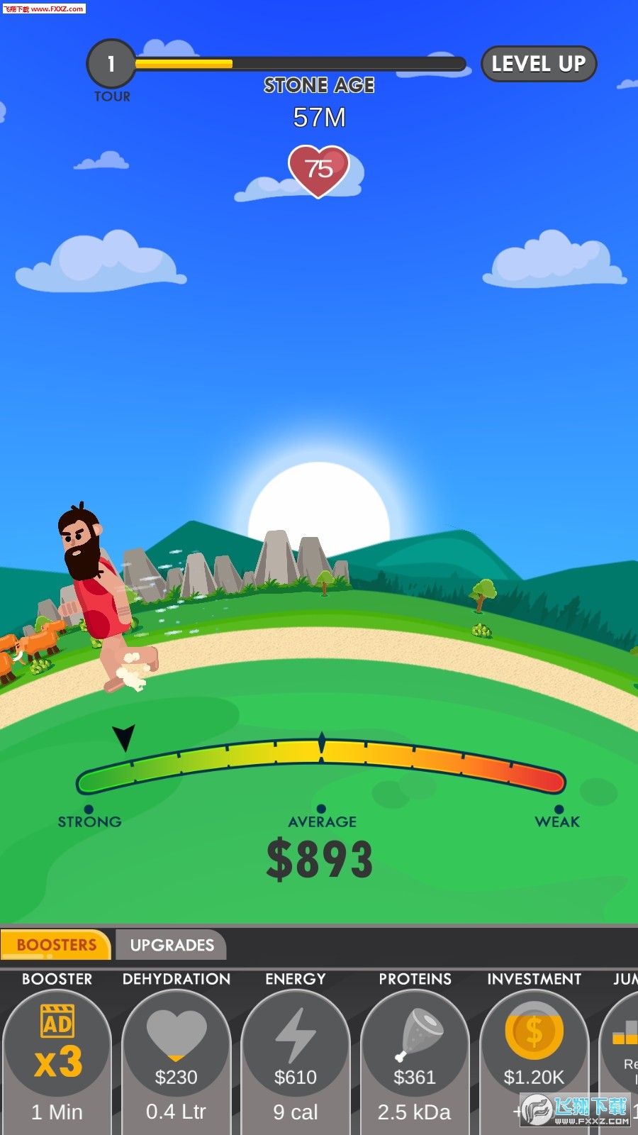 1、放置类玩法,点击屏幕,奔跑者轻松赚金币,玩家不存在金钱困扰。