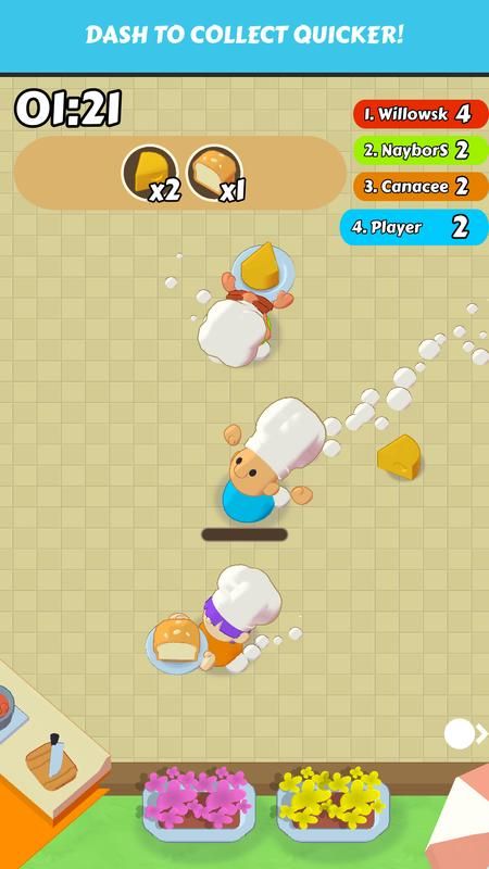 玩家需要作为厨师,用手中的盘子获取地图上出现的各种食材,及时递送给顾客,完成订单以获得分数,在时间结束前争夺最高分。