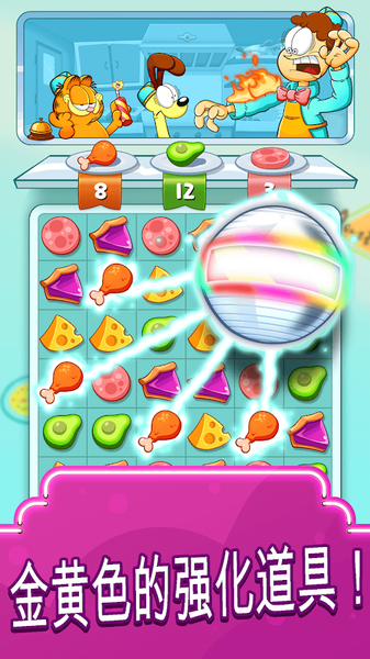 加菲猫快餐车这款游戏是一款有趣的餐车经营类型的手游,在这个游戏中帮助加菲猫偷取食物,体验这个好玩有趣的美食向的消除游戏吧!