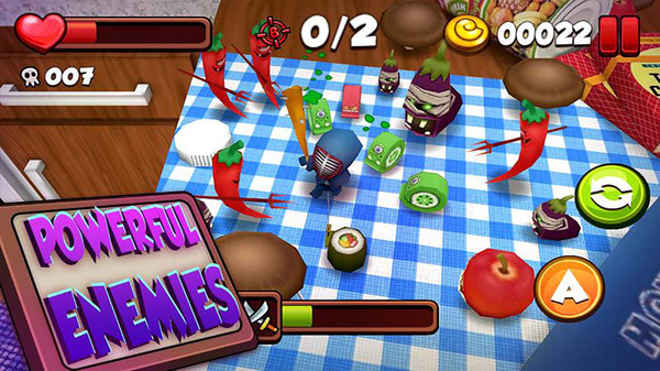 厨房大作战游戏是一款比较萌系的动作射击手游,玩法十分轻松休闲有趣,游戏画面精致高清,里面关卡的设定也是非常的有趣,在某一天厨房突然出现怪物的袭击,玩家需要拿起手中的武器捍卫厨房的尊严,将这些食物妖怪全部给安排的明明白白的,让它们知道在这里是由谁说了算,喜欢的快来下载吧!