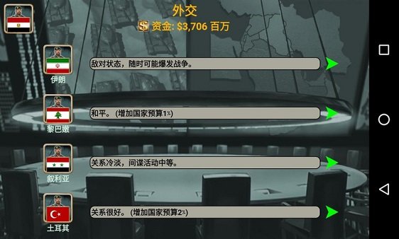1、在游戏中你可以选择众多国家,包括:埃及,巴勒斯坦,伊朗,黎巴嫩,叙利亚,土耳其,约旦,伊拉克,科威特,沙特阿拉伯,阿拉伯联合酋长国,也门,阿曼,卡塔尔,巴林,塞浦路斯和以色列;