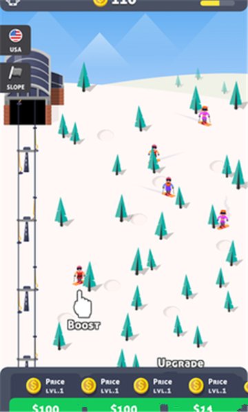 3、不断解锁各项不同的滑雪场,赚取更多金币。