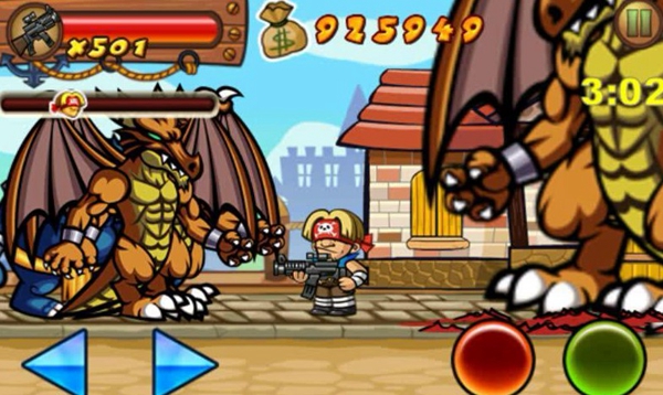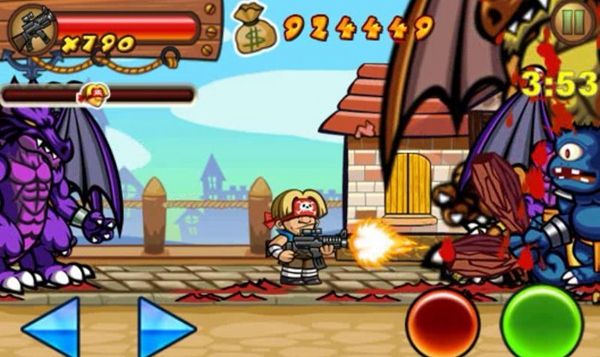 在游戏里面你将要扮演一个能够拯救世界的孤胆英雄杰克。游戏的操作非常简单,屏幕左侧下方的两个箭头控制人物的左右移动,右侧的两个按钮控制攻击(红色为近程攻击,绿色为远程攻击)。