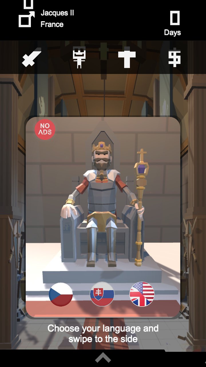 一款纸牌游戏,游戏中,玩家做的每个决定都会影响游戏进程。开动脑筋左右滑动做出合理决策,尽可能的保住自己的王位!