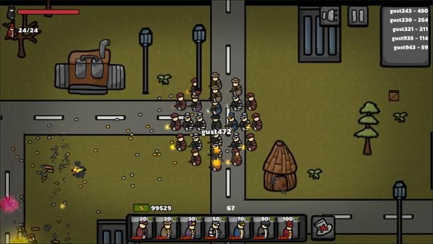 将射击生存元素,融入io混战,两方人马举枪对射,子弹就像天女散花一样,基本都是无差别攻击,注意走位躲避,减少伤害。