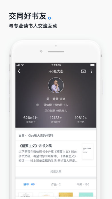 在提供极致阅读体验的同时,为用户推荐合适的书籍,并可查看微信好友的读书动态、与好友讨论正在阅读的书籍等。