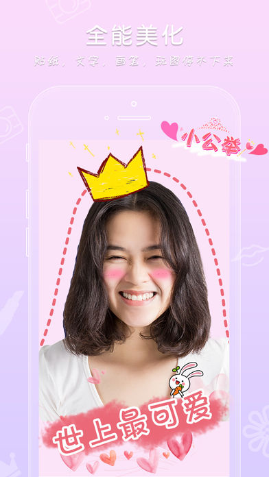 上百款贴纸,贱萌、可爱、女神、街拍、森女、清新……超多风格可供选择。智能表情贴纸,自动识别人脸,把眼睛鼻子耳朵自动贴在正确的位置上!不用拖来拖去对准啦。