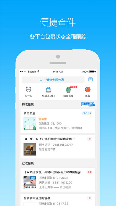 菜鸟网络官方出品,一款提供免费查快递、优惠寄快递、代收包裹等快递相关服务的应用,支持淘宝、天猫、苏宁等各主要电商平台全网包裹自动跟踪,覆盖国内外140多家快递公司。