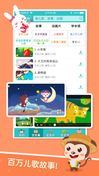 儿歌多多原创的精选儿歌故事,更有成语寓言,绘本动画及早教英语等内容,深受家长和小朋友们的喜爱。