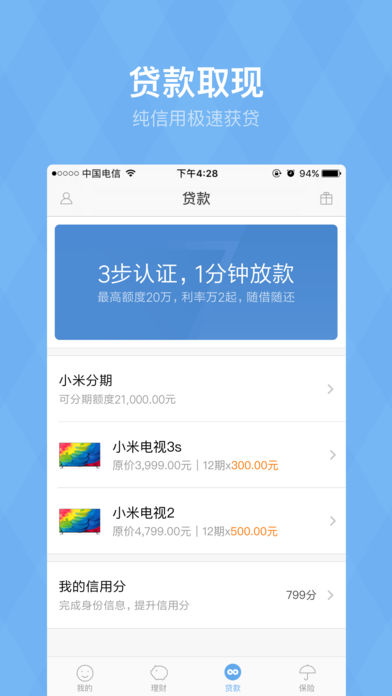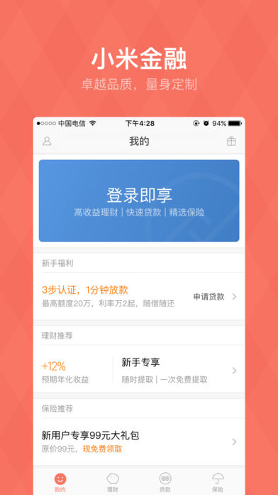 小米金融是个人综合金融服务平台,提供理财、贷款和保险等金融服务。为用户精选收益远超银行存款数倍的理财产品,安全稳赚,随时随地、轻松快捷的享受金融服务;为用户定制极速、高额、无抵押的贷款产品,3分钟内轻松获贷;结合小米大数据精心定制最合身的保险产品,给用户365天全方位保障;小米出品,必属精品,值得您信赖。小米,用科技畅享金融!