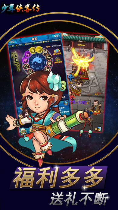 少年侠客传是一款背景设定史诗感爆棚的手机武侠风游戏。游戏中你将扮演一代大侠的少年时期,感受他无与伦比的成长经历。游戏好玩不累,人物建模精细,全景无缝大地图可以探索的地方非常多,可玩性很强!