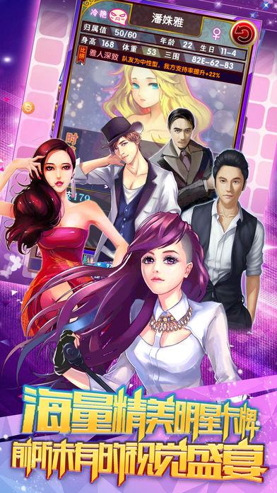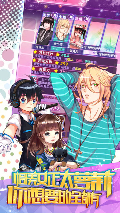 梦幻明星模拟是一款二次元元素满满的手机明星模拟游戏。游戏中玩家将会成为一家经纪公司的经纪人,通过招募等方式把小鲜肉们拉进公司,然后慢慢培养他们,让他们成为如日中天的大明星!