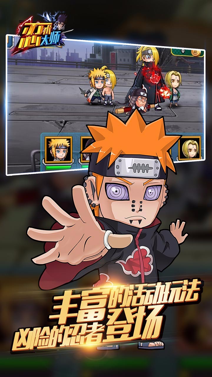 忍术大师为您号召火影忍者各村落忍者集结,每次可以上阵五名忍者伙伴,打倒小兵获取查克拉,通灵兽召唤,奥义技能送给BOSS,忍术大师手游经典策略卡牌战,再现忍界圣战。